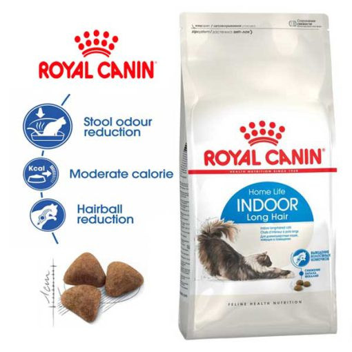 گربه هایی که در داخل خانه نگهداری می شوند نسبت به گربه های بیرون خانه تحرک بسیار کمی دارند و در نتیجه میزان مصرف انرژی در آنها کمتر است و این امر در صورت تغذیه نامناسب و بیش از اندازه موجب افزایش وزن و چاقی گربه خواهد شد. از طرفی گربه های مو بلند نیز شرایط ویژه ای دارند. گربه ها در طول روز به طور مداوم از طریق لیست زدن بدن خود به رسیدگی و نظافت پوست و مویشان می پردازند. طبعا حجم قابل توجهی از مو همراه با اینکار وارد سیستم گوارشی آنها می شود که در صورت ادامه و دفع نشدن مشکل ساز خواهد بود. غذای رویال کنین مخصوص گربه های مو بلند داخل خانه با ترکیب ویژه خود مزایای زیر را به همراه دارد: