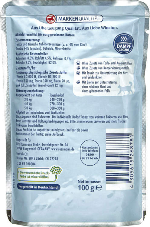 Winston Fine Meal بر اساس آخرین یافته های علمی و به طور ویژه با نیازهای تغذیه ای گربه شما طراحی شده است. مواد خام انتخابی در فرآیندی ملایم تهیه میشوند تا مواد مغذی مهم و بلوکهای ساختمانی تا حد امکان حفظ شوند. بیوتین اضافه شده می تواند پوششی براق و پوستی زیبا را پشتیبانی کند. تورین می تواند به تقویت بینایی و حمایت از نیروی انقباض عضله قلب کمک کند. کیفیتی که طعم بسیار خوبی برای گربه شما دارد.